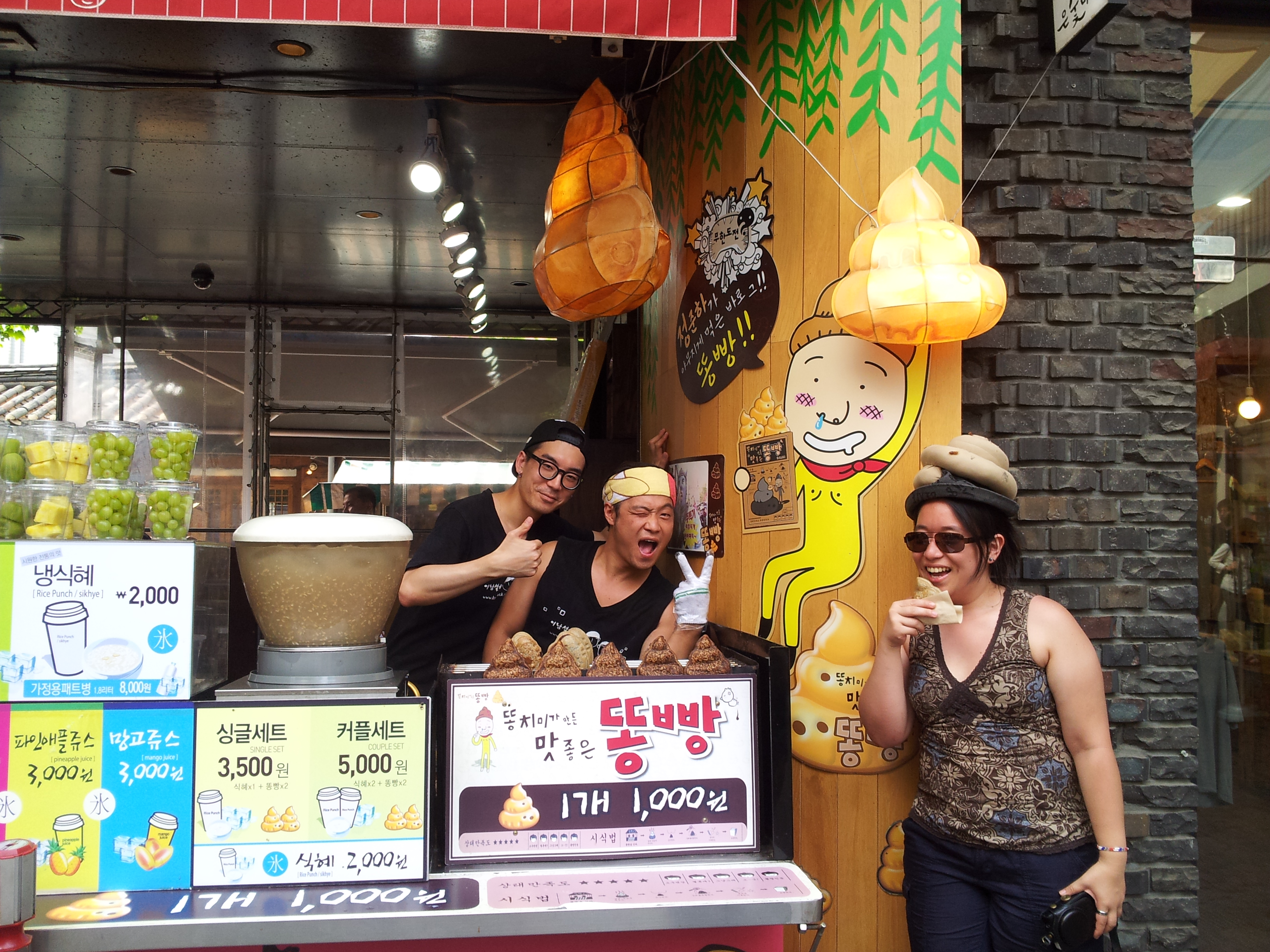 If you like red bean, and you’re in Insadong (which is a great area for visitors to Seoul, so you probably will be), go try Poo Bread! You may even be lucky enough to have the privilege of wearing the turd hat.