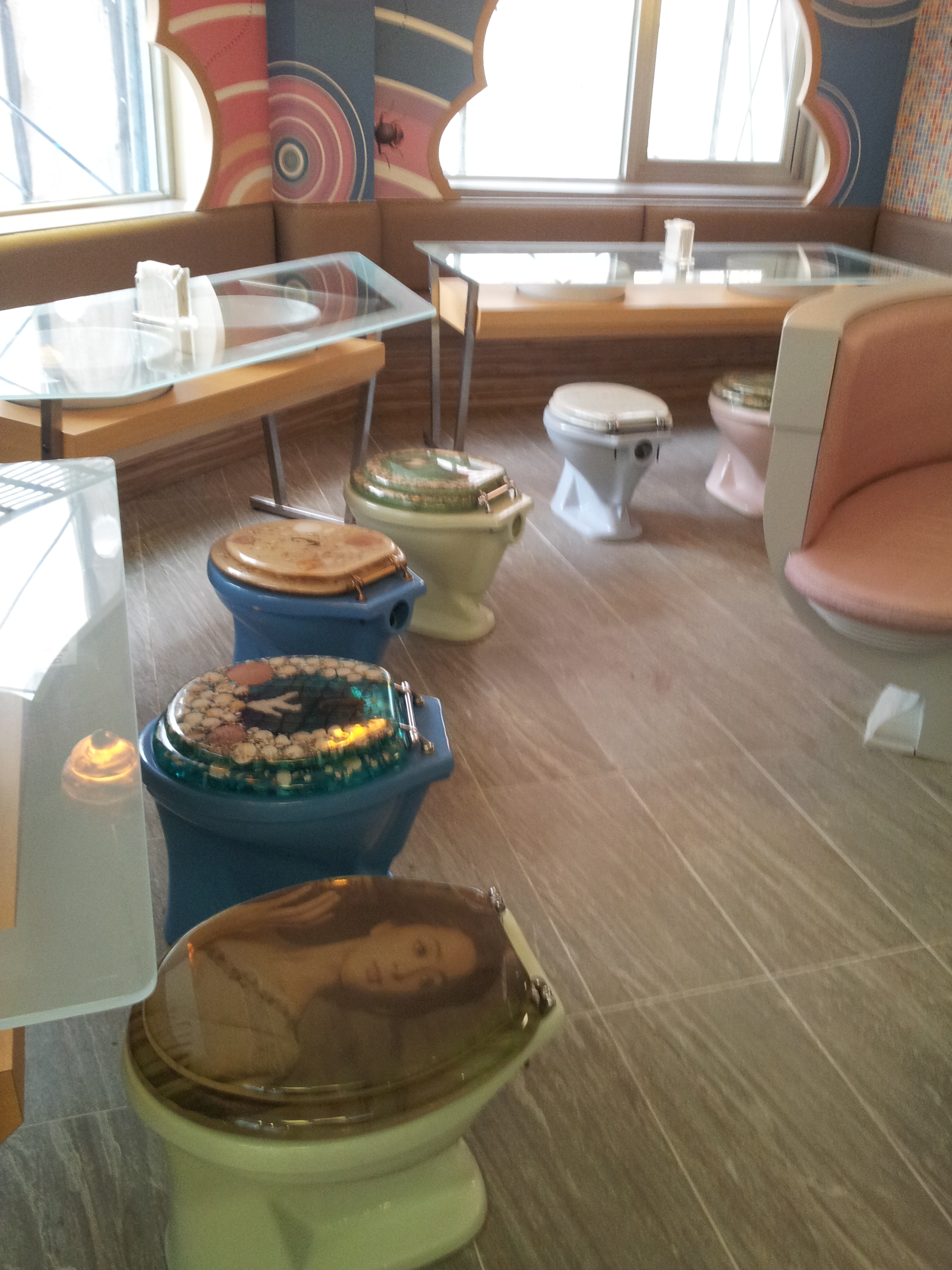 *I did dress up as a toilet once in elementary school, for Halloween. My siblings and neighbours and I went as a kind of “bathroom set”, with a toilet, bathtub, sink, and soap. We argued over who got to be the toilet. So maybe my attraction to these places has more to do with personal interest than their quirky novelty? Something to think about.