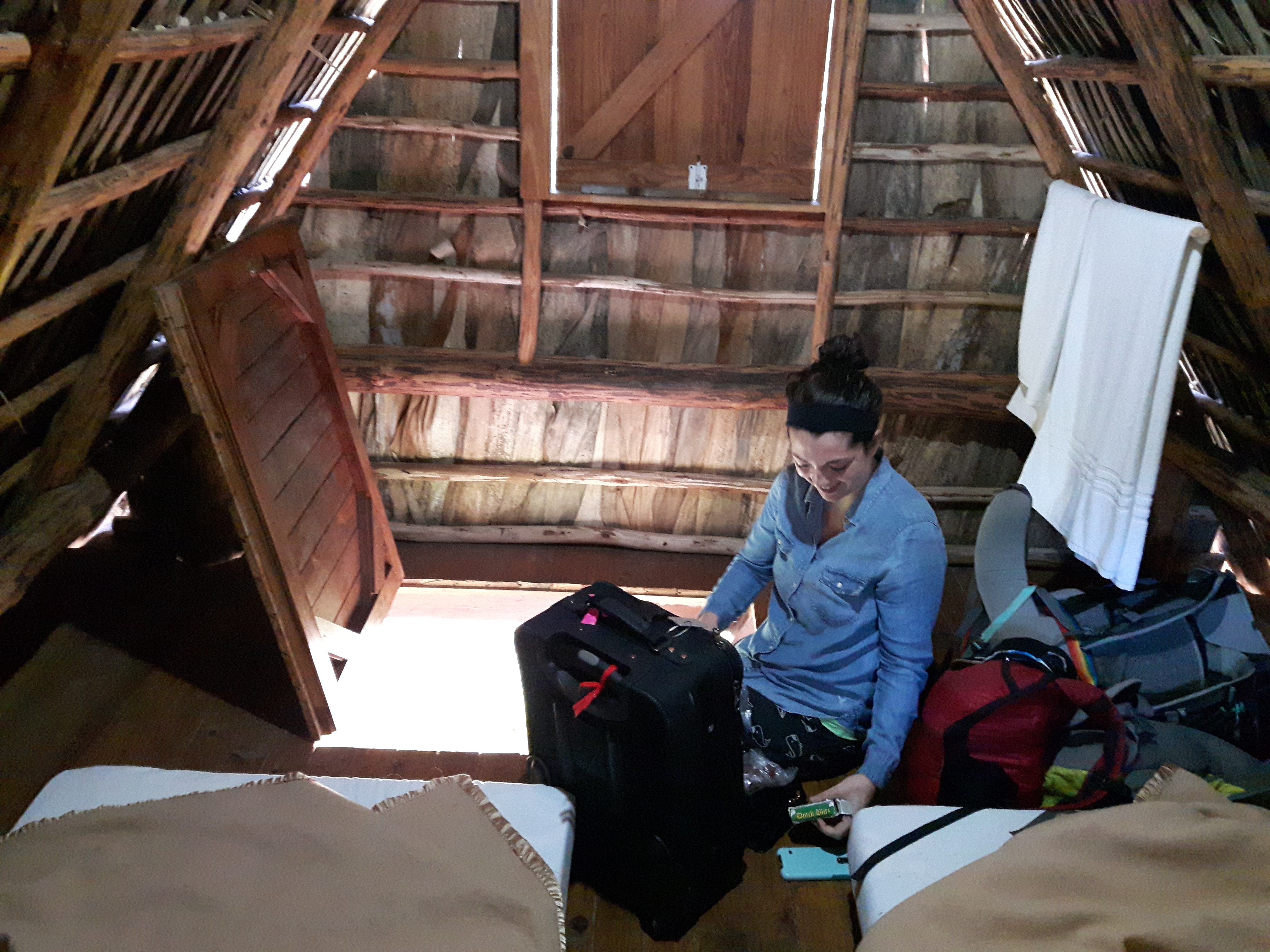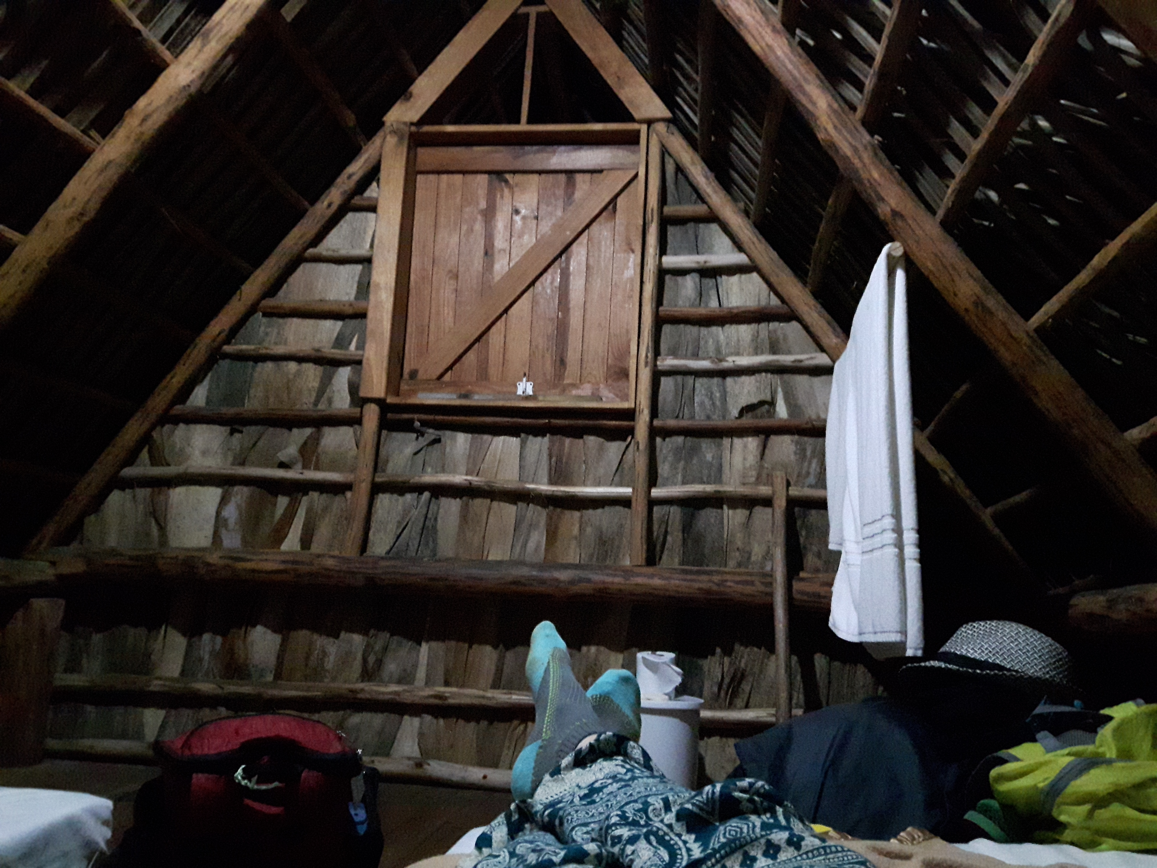 The wooden cabins are held up by four sturdy posts, and you enter through a heavy trapdoor, via ladder (maybe only heavy cause I’m weak, but it was a struggle). Then voilà, you’re in (a very simple) paradise! The cabañas are equipped with two mattresses, TP, a towel, a light, an outlet (ours didn’t work), windows that can be propped open, and picnic tables below. Bathrooms and showers are outside, so I highly recommend emptying your bladder before going to bed so that you don’t have to navigate the trapdoor/ladder situation at night!
