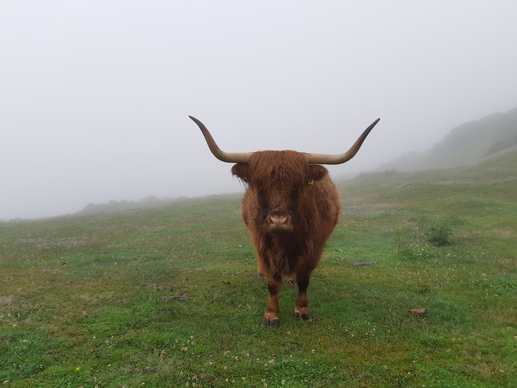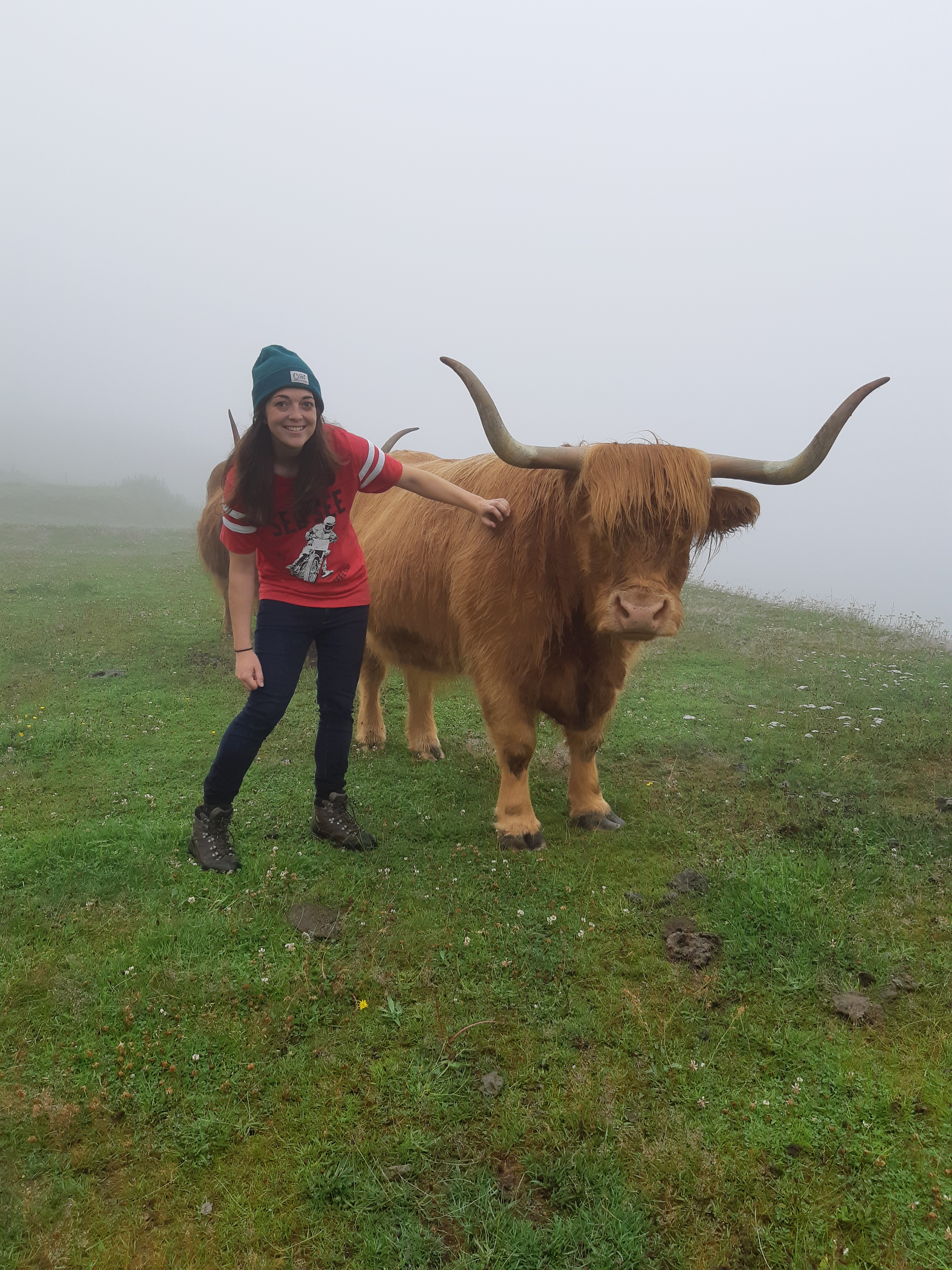 I was DETERMINED to see some Highland Cattle on our Scotland trip! This proved to be a bit difficult, since I stayed in the city (Kyla saw lots on her highland and Skye road trip), but mission was accomplished! Of course I’d done loads of research and discovered there were a couple of places nearish to Edinburgh to see them. The first, Prestonfield House, was only mildly successful: there were 2 coos – only one orange – way far out in a gated field. Not good enough! So when Kyla got back with her rental car, she very kindly agreed to drive down to Swanston Farm (after days of stressful driving) so that I could try one more time to make my Scotland dreams come true. We found the farm… shrouded in a heavy fog! We could barely see each other, let alone any cows! But before giving up, I read on the website that you could enter the gated area, so in we went, uphill, (hopefully) towards the coos! We were both vaguely nervous about the idea of giant horns appearing out of nowhere through the fog, and the grass was long and wet and filled with cow patties, but I was highly motivated! Finally, at the top of the hill, we spotted some sheep, and I tried to accept the fact that this might be the only Scottish wildlife I would see. Kyla suggested we just go a bit farther before heading back, so up and over some rocks we went when all of a sudden… we made out a vague orange blob! A little further and we saw two… three… four hairy cows! A farm employee arrived at the same time, trying to urge them down the hill so that her mother, who couldn’t make the walk up, could see them. She told us their names, and that one was chill enough to pet! I was elated! Kyla thought they were kind of soggy hahaha. We hung out with Thelma and Louise for a while before heading back to town to change out of out wet, cow poo pants, still smiling from ear to ear. So there you have it, proof that a little rain won’t stop your Scottish dreams from coming true!