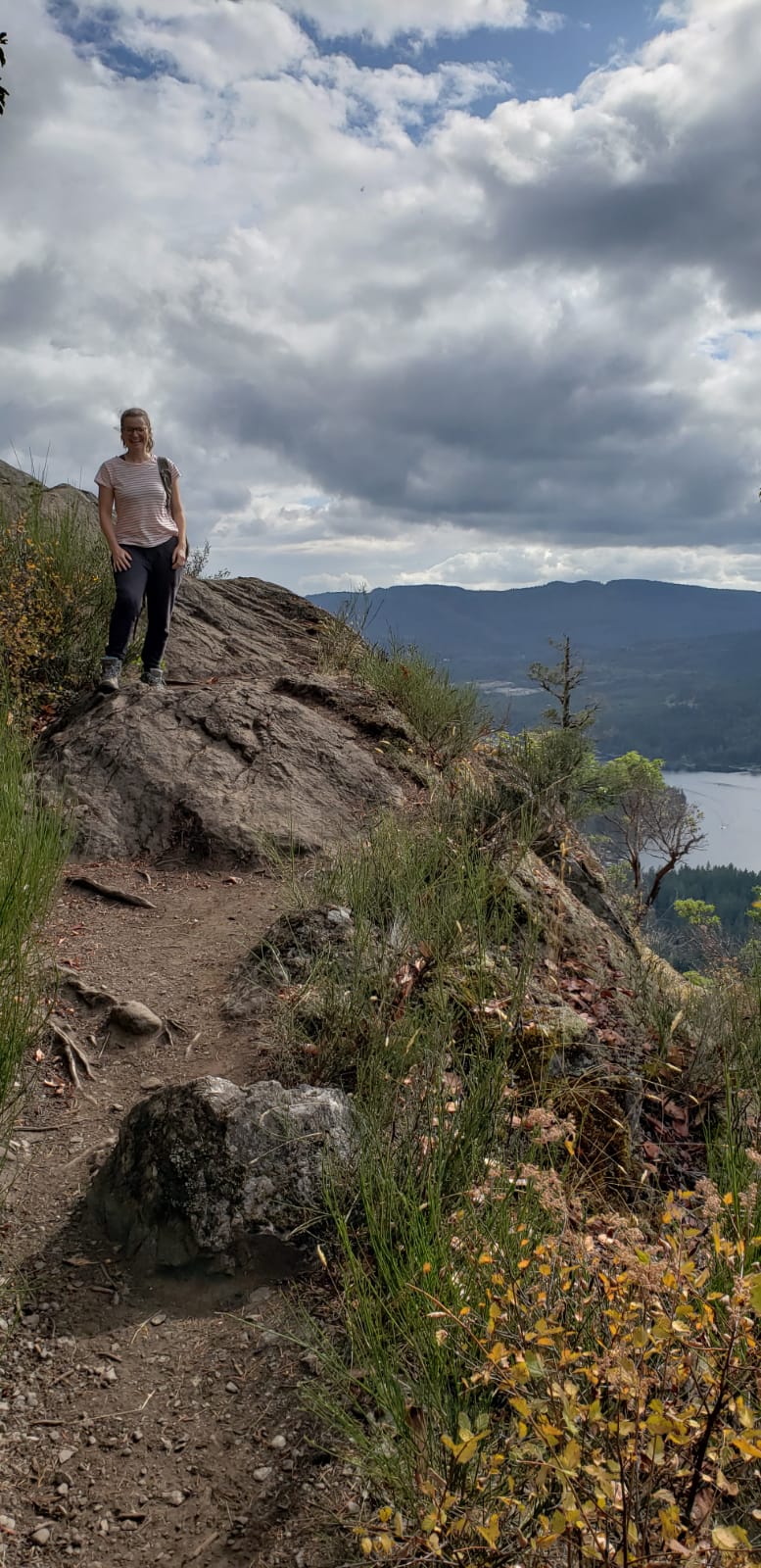 The swing was hard to find! I expected to just see it at the top, but the summit is open and rocky with no swing in sight. We looked around for a while and were almost ready to give up when we saw someone swinging on it! To get there: the path continues past the summit (and eventually down to the other trailhead, I think), so if you keep walking a little further, staying on the Shawnigan Lake side, you’ll get to it just a minute or 2 past the summit.
